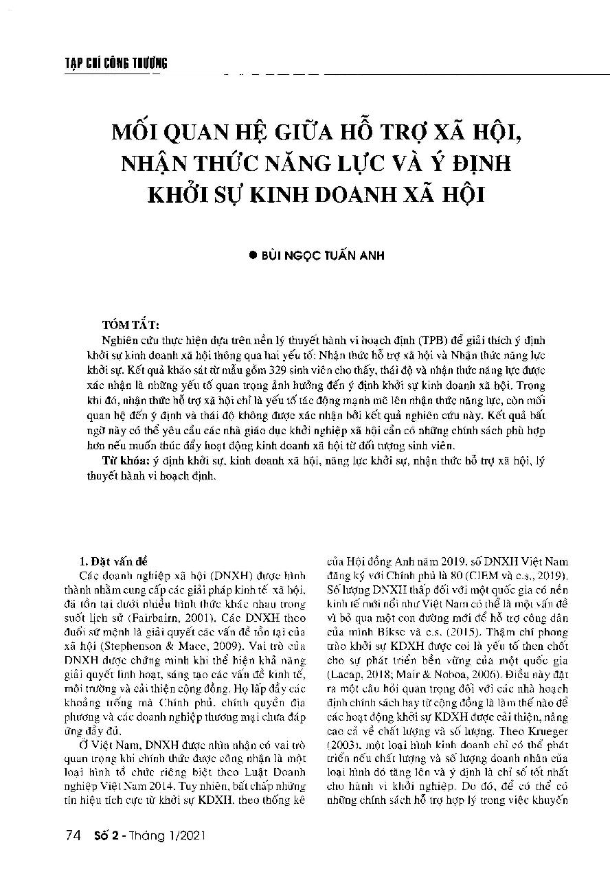 Mối quan hệ giữa hỗ trợ xã hội, nhận thức năng lực và ý định khởi sự kinh doanh xã hội = The relationship among the perceived social support, social entrepreneurial self-efficacy and social entrepreneurship intention