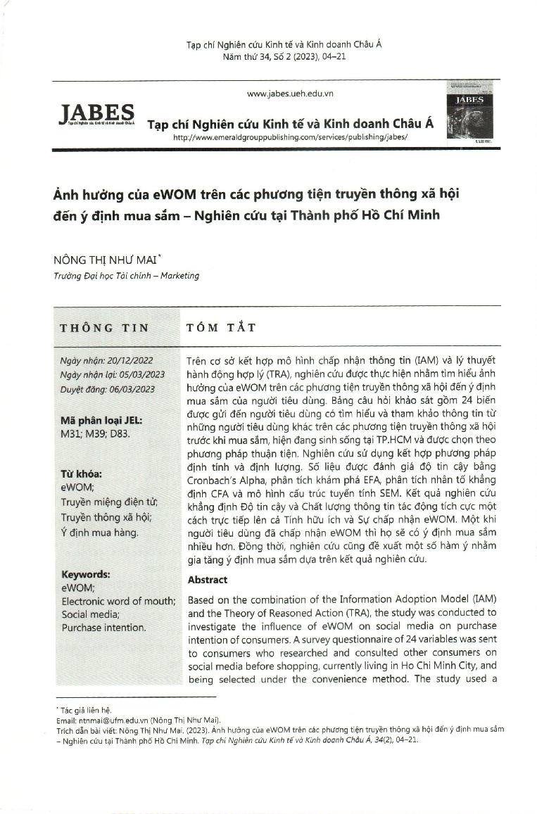 Ảnh hưởng của eWOM trên các phương tiện truyền thông xã hội đến ý định mua sắm – Nghiên cứu tại Thành phố Hồ Chí Minh = The influence of eWOM on social media on shopping intention – Research in Ho Chi Minh City
