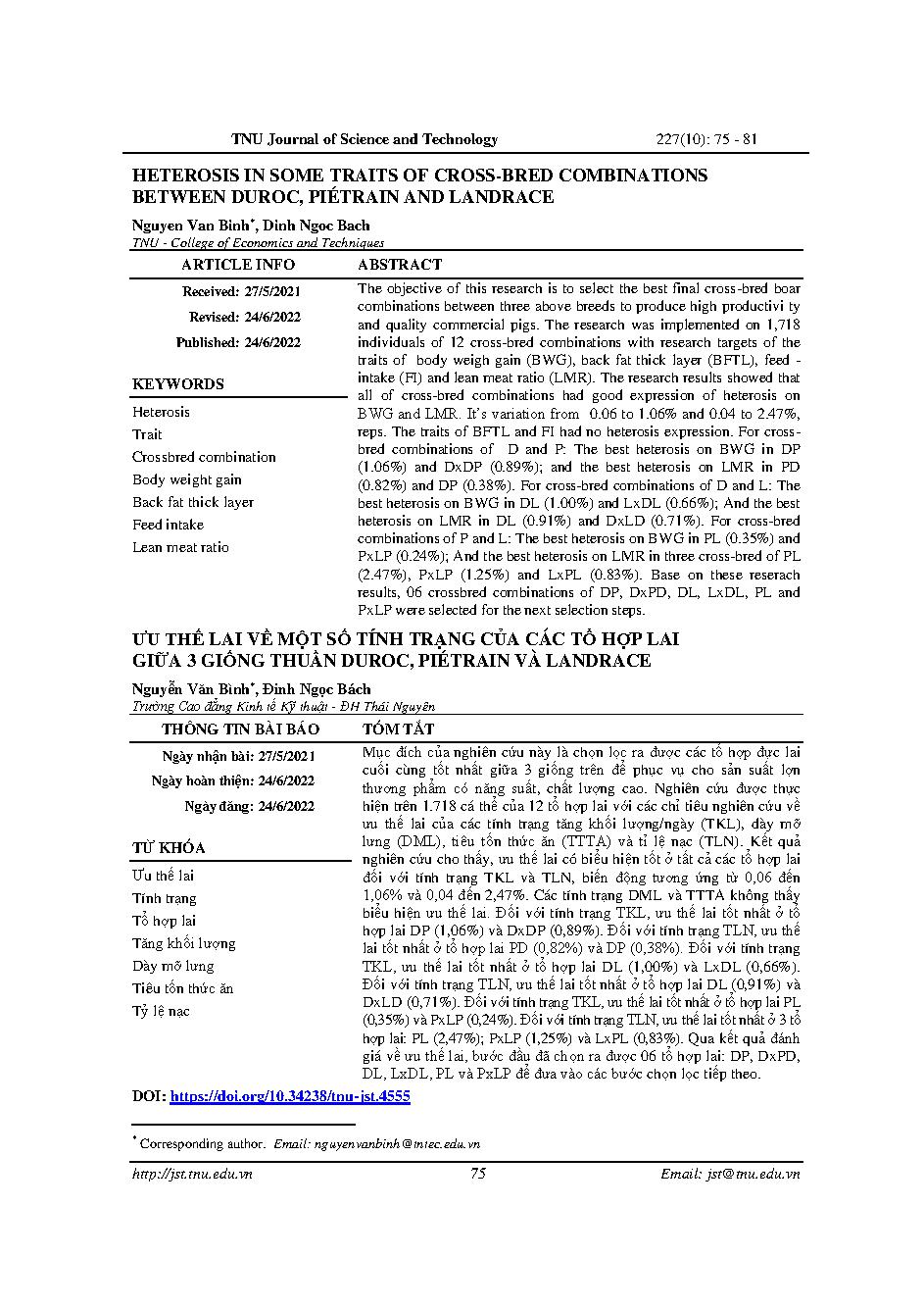 Ưu thế lai về một số tính trạng của các tổ hợp lai giữa 3 giống thuần duroc, piétrain và landrace = Heterosis in some traits of cross-bred combinations between duroc, piétrain and landrace