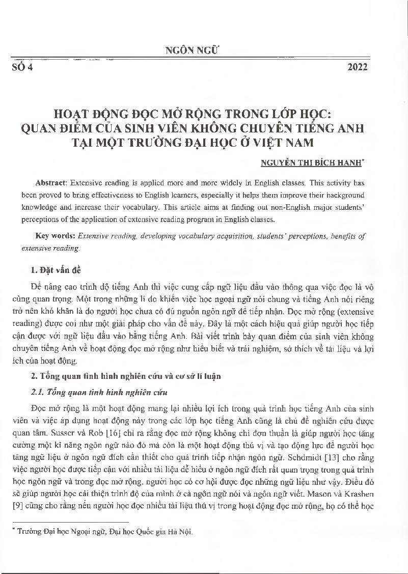 Hoạt động đọc mở rộng trong lớp học: Quan điểm của sinh viên không chuyên tiếng Anh tại một trường đại học ở Việt Nam = Extensive reading activities: Perceptions of non-English major university students in Vietnam
