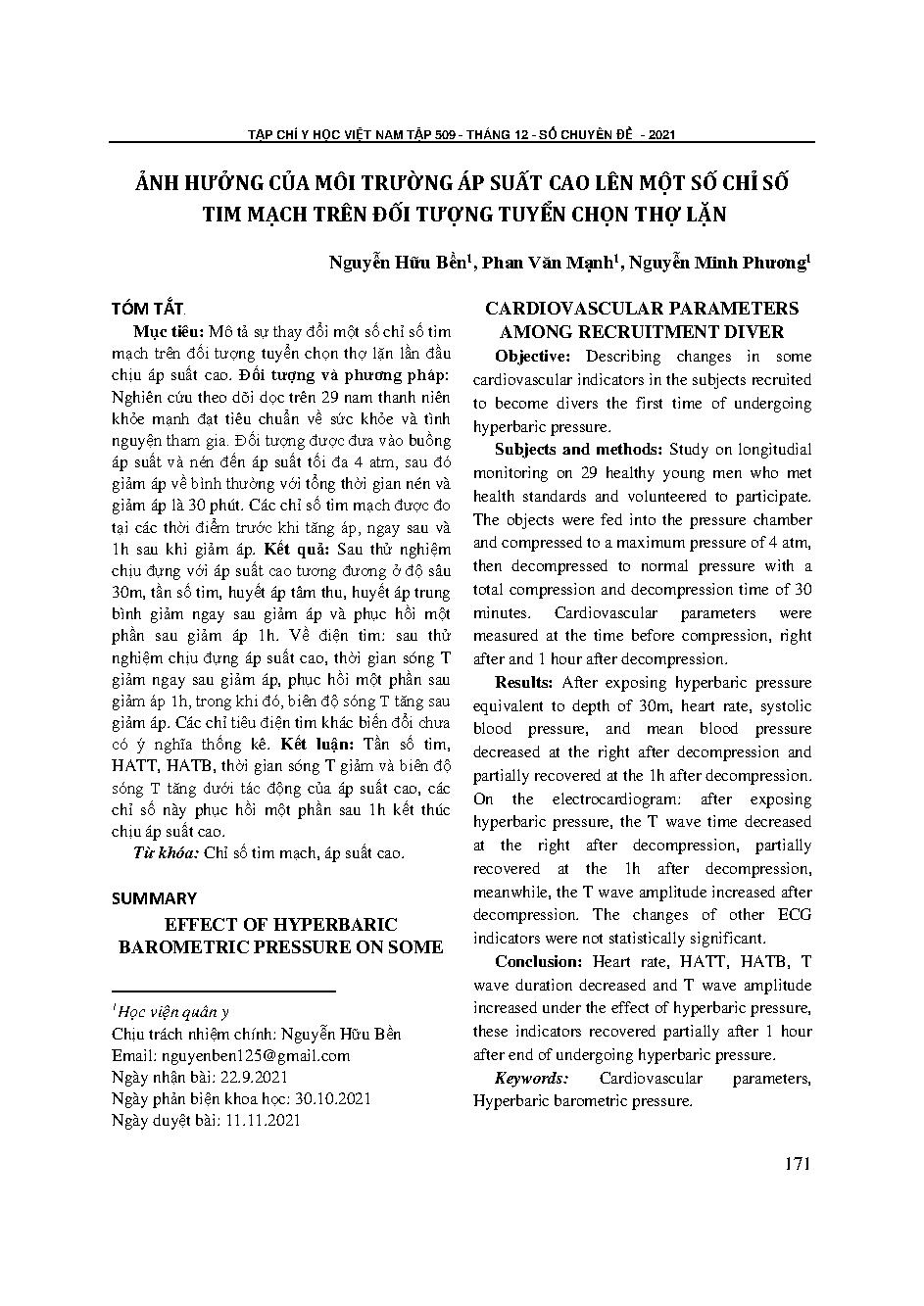 Ảnh hưởng của môi trường áp suất cao lên một số chỉ số tim mạch trên đối tượng tuyển chọn thợ lặn
