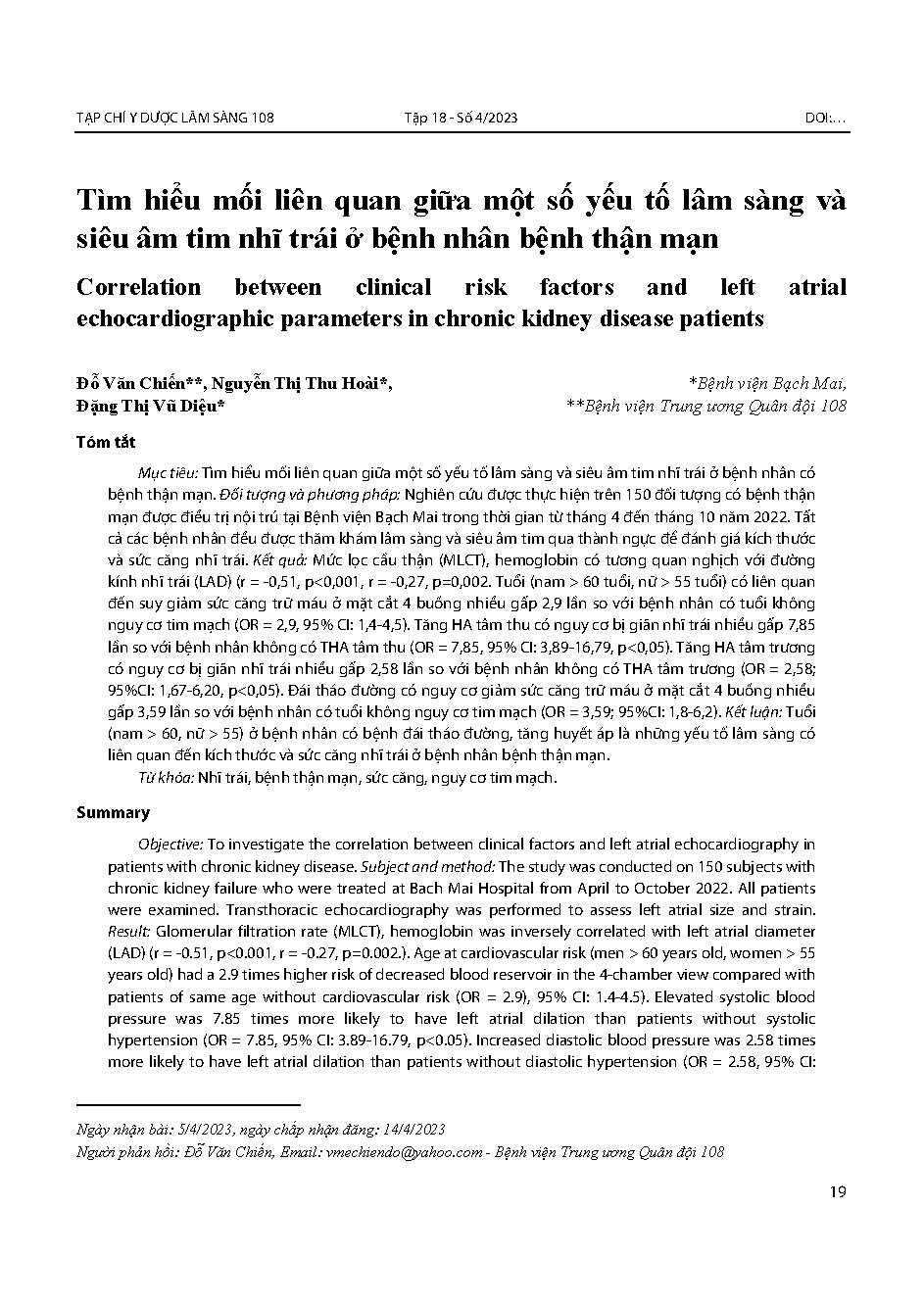 Tìm hiểu mối liên quan giữa một số yếu tố lâm sàng và siêu âm tim nhĩ trái ở bệnh nhân bệnh thận mạn = Correlation between clinical risk factors and left atrial echocardiographic parameters in chronic kidney disease patients