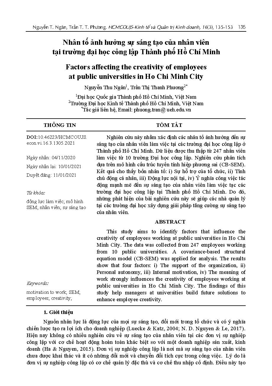 Nhân tố ảnh hưởng sự sáng tạo của nhân viên tại trường đại học công lập Thành phố Hồ Chí Minh = Factors affecting the creativity of employees at public universities in Ho Chi Minh City