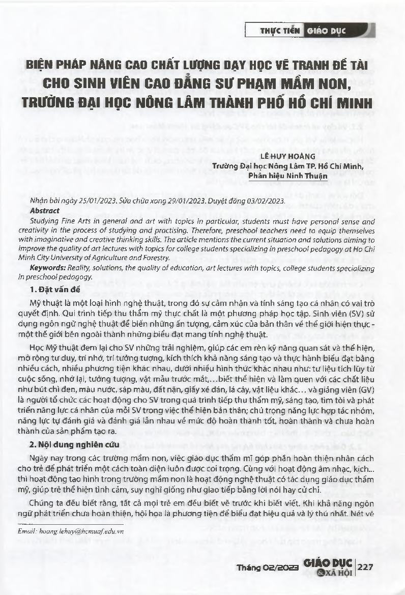 Biện pháp nâng cao chất lượng dạy học vẽ tranh đề tài cho sinh viên Cao đẳng Sư phạm Mầm non, Trường Đại học Nông Lâm Thành phố Hồ Chí Minh = Solutions to improve the quality of art lectures with topics for college students specializing in preschool pedag