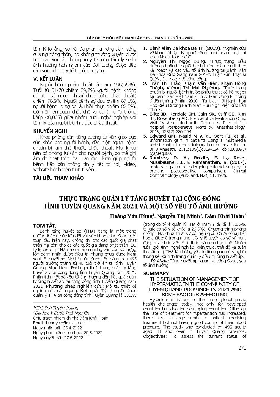 Thực trạng quản lý tăng huyết áp tại cộng đồng tỉnh Tuyên Quang năm 2021 và một số yếu tố ảnh hưởng = The situation of management of hypermatic in the community of Tuyen Quang province in 2021 and some factors affecting