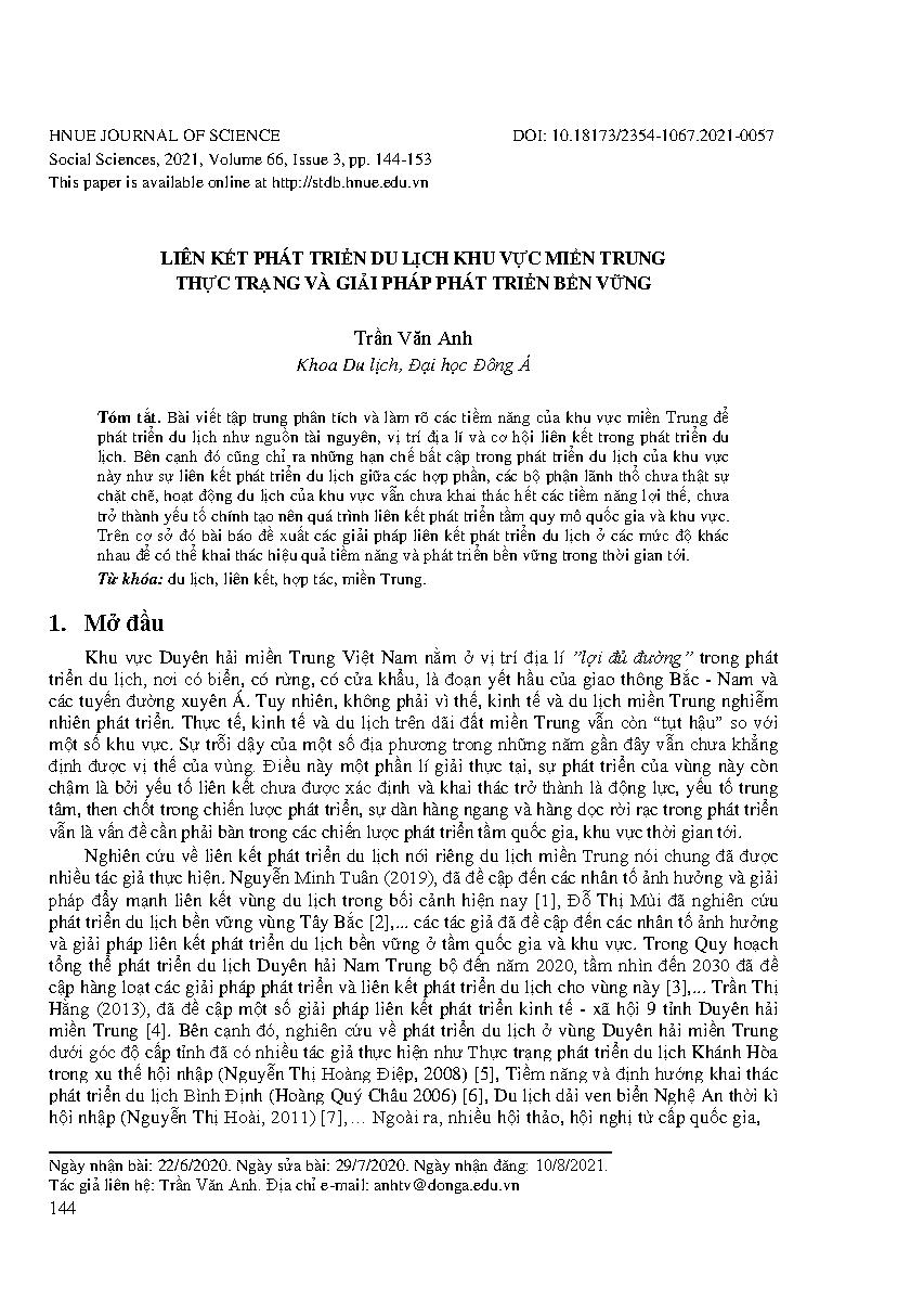 Liên kết phát triển du lịch khu vực miền Trung thực trạng và giải pháp phát triển bền vững = Connection for tourism development in the central region status and solusions to sustainable development