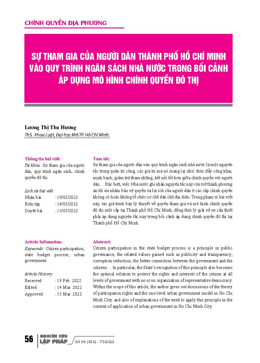 Sự tham gia của người dân thành phố Hồ Chí Minh vào quy trình ngân sách nhà nước trong bối cảnh áp dụng mô hình chính quyền đô thị = Citizen Participation in Ho Chi Minh City in the State Budget Process under Context of Application of Urban Government Mod