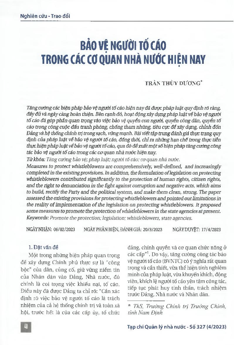 Bảo vệ người tố cáo trong các cơ quan nhà nước hiện nay = Protecting whistleblowers in state agencies today
