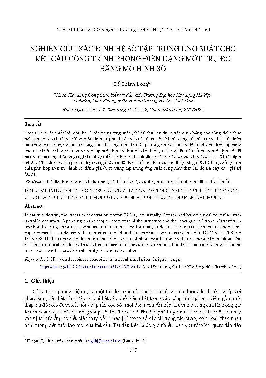 Nghiên cứu xác định hệ số tập trung ứng suất cho kết cấu công trình phong điện dạng một trụ đỡ bằng mô hình số = Determination of the stress concentration factors for the structure of offshore wind turbine with monopile foundation by using numerical modeL