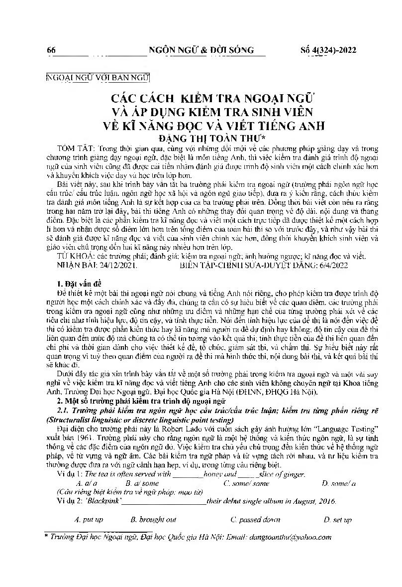 Các cách kiểm tra ngoại ngữ và áp dụng kiểm tra sinh viên về kĩ năng đọc và viết tiếng Anh = Some ways of language testing and the application of testing students on reading and writing skills in English