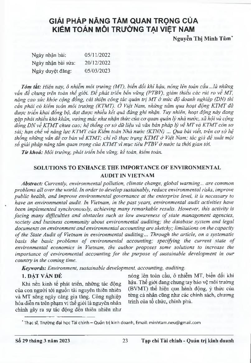 Giải pháp nâng tầm quan trọng của kiểm toán môi trường tại Việt Nam = Solutions to enhance the importance of environmental audit in Vietnam