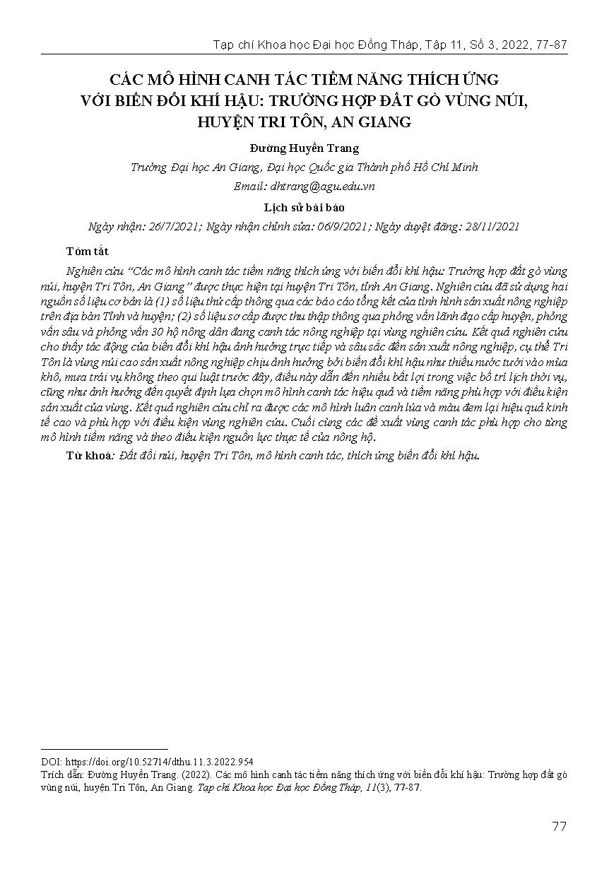 Các mô hình canh tác tiềm năng thích ứng với biến đổi khí hậu: Trường hợp đất gò vùng núi, huyện Tri Tôn, An Giang = Potential farming systems with adaptation to climate change: a case study of hilly land in mountainous areas, in Tri Ton district, An Gian