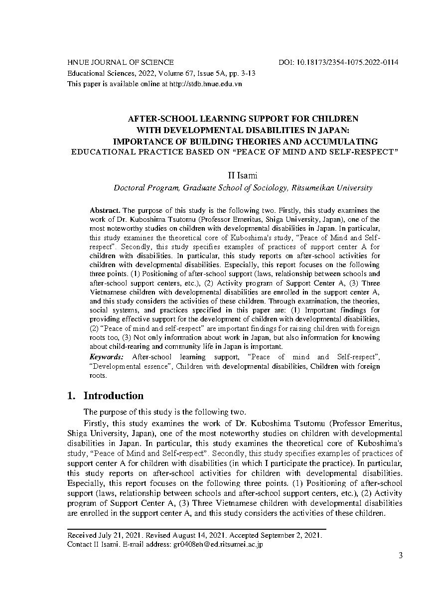 Hỗ trợ học tập sau giờ học cho trẻ khuyết tật phát triển ở Nhật Bản: tầm quan trọng của việc xây dựng lý thuyết và tích lũy thực hành giáo dục dựa trên “sự an tâm và tự trọng” = After-school learning support for children with developmental disabilities in