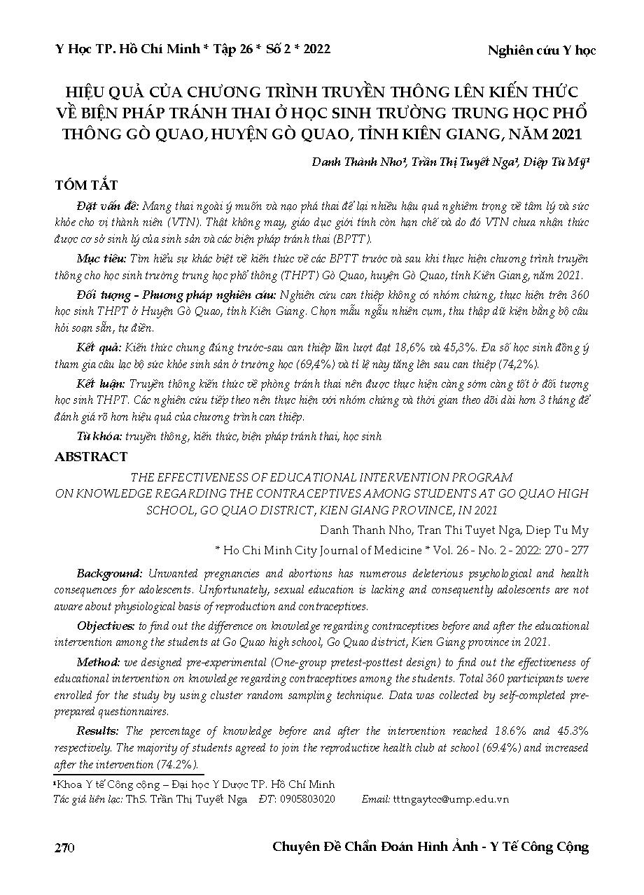 Hiệu quả của chương trình truyền thông lên kiến thức về biện pháp tránh thai ở học sinh Trường Trung học phổ thông Gò Quao, huyện Gò Quao, tỉnh Kiên Giang, năm 2021