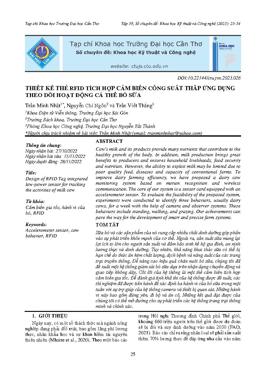 Thiết kế thẻ RFID tích hợp cảm biến công suất thấp ứng dụng theo dõi hoạt động cá thể bò sữa = Design of RFID Tag integrated low-power sensor for tracking the activities of milk cow