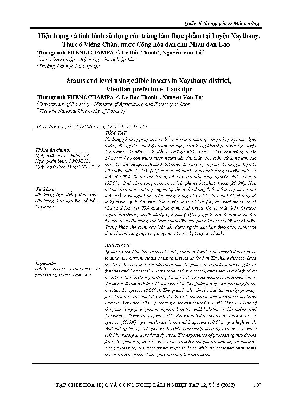 Hiện trạng và tình hình sử dụng côn trùng làm thực phẩm tại huyện Xaythany, Thủ đô Viêng Chăn, nước Cộng hòa dân chủ Nhân dân Lào = Status and level using edible insects in Xaythany district, Vientian prefecture, Laos dpr