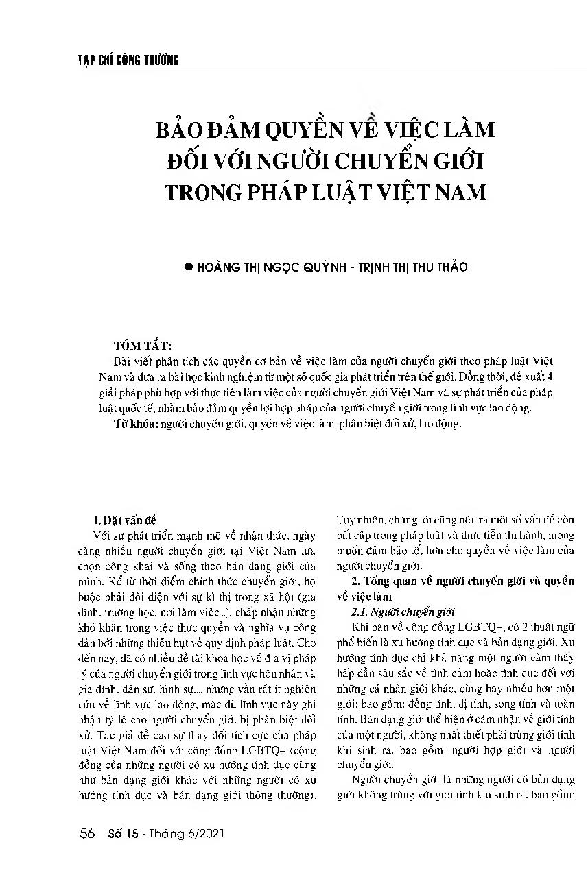 Bảo đàm quyền về việc làm đối với người chuyển giới trong pháp luật Việt Nam = Ensuring the employment rights of transgender people under Vietnam's laws
