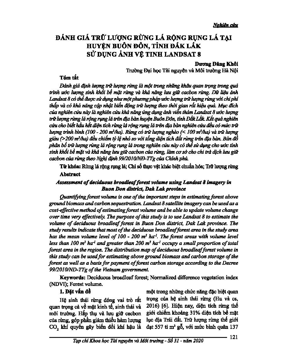 Assessment of deciduous broadleaf forest volume using Landsat 8 imagery in Buon Don district, Dak Lak province = 12. ĐÁNH GIÁ TRỮ LƯỢNG RỪNG LÁ RỘNG RỤNG LÁ TẠI HUYỆN BUÔN ĐÔN, TỈNH ĐẮK LẮK SỬ DỤNG ẢNH VỆ TINH LANDSAT 8