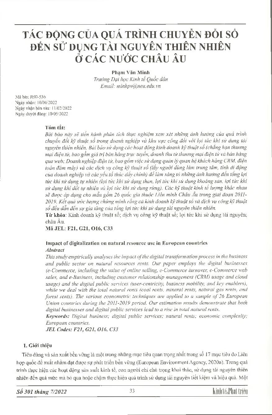 Tác động của quá trình chuyển đổi số đến sử dụng tài nguyên thiên nhiên ở các nước Châu Âu