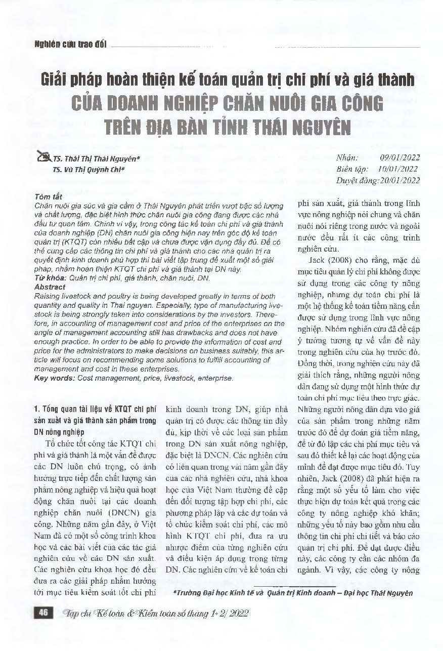 Giải pháp hoàn thiện kế toán quản trị chi phí và giá thành của doanh nghiệp chăn nuôi gia công trên địa bàn tỉnh Thái Nguyên = The solutions to fulfill accounting of management cost and price in manufacturing livestocking enterprises
