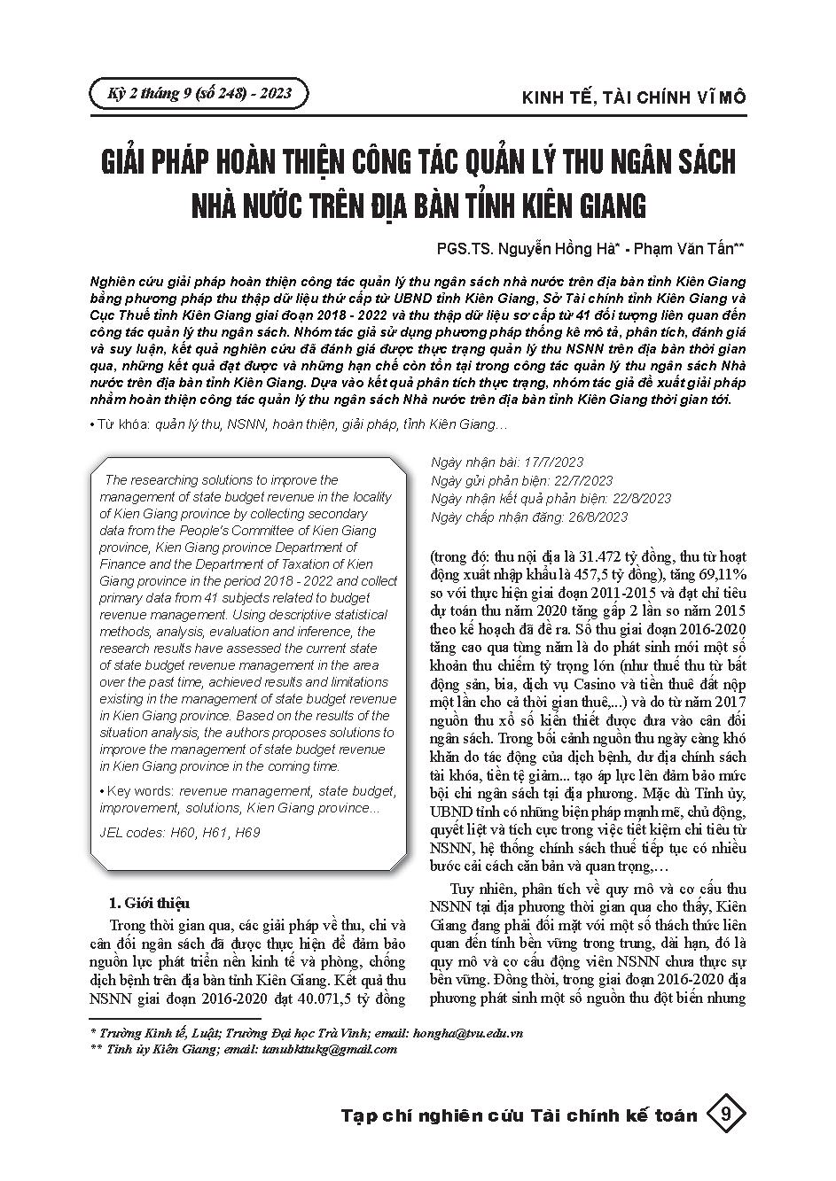 Giải pháp hoàn thiện công tác quản lý thu ngân sách nhà nước trên địa bàn tỉnh Kiên Giang = Solutions for improving the state budget management at the provincial level of Kien Giang province