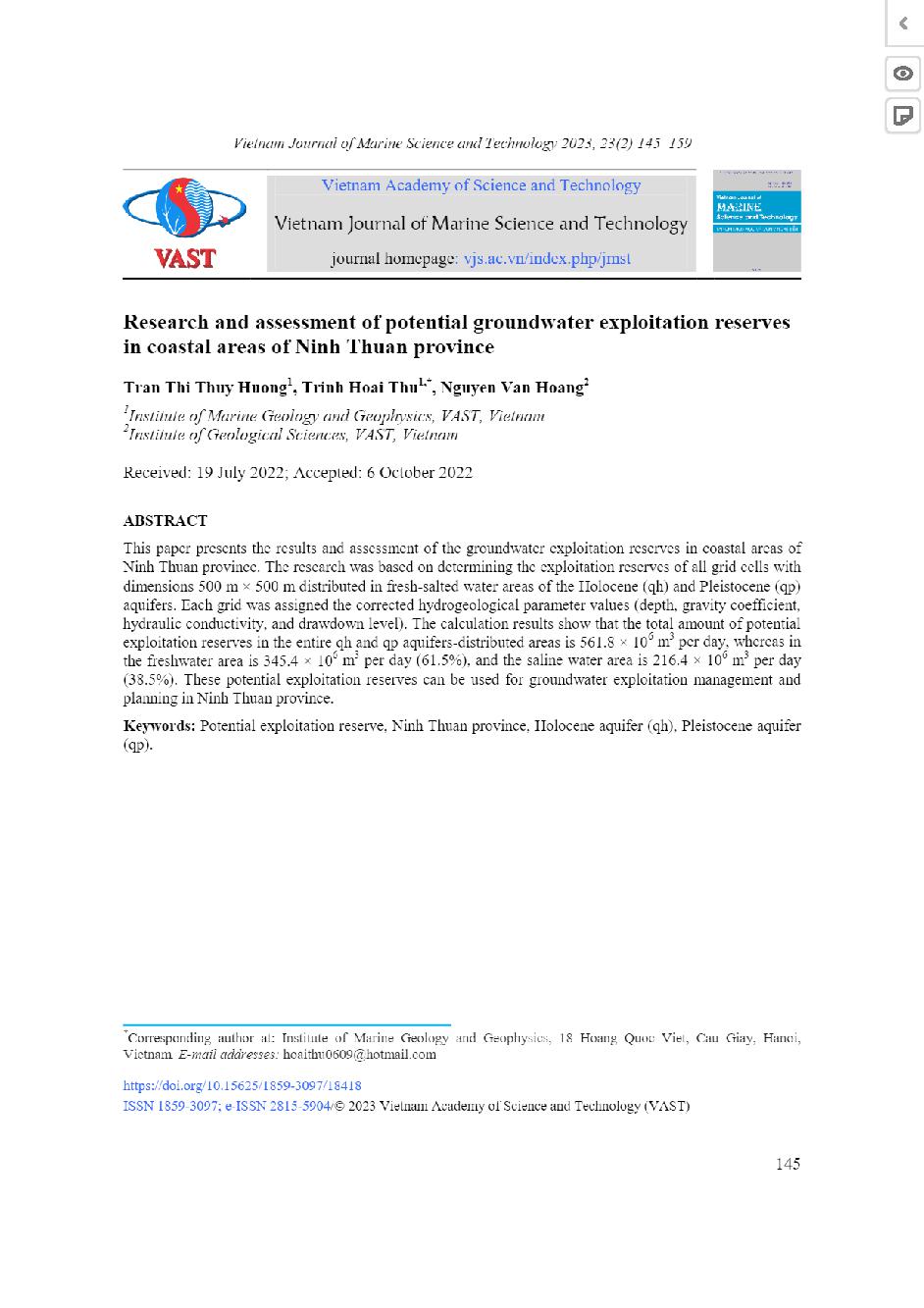 Nghiên cứu đánh giá trữ lượng tiềm năng khai thác nước ngầm vùng ven biển tỉnh Ninh Thuận = Research and assessment of potential groundwater exploitation reserves in coastal areas of Ninh Thuan province