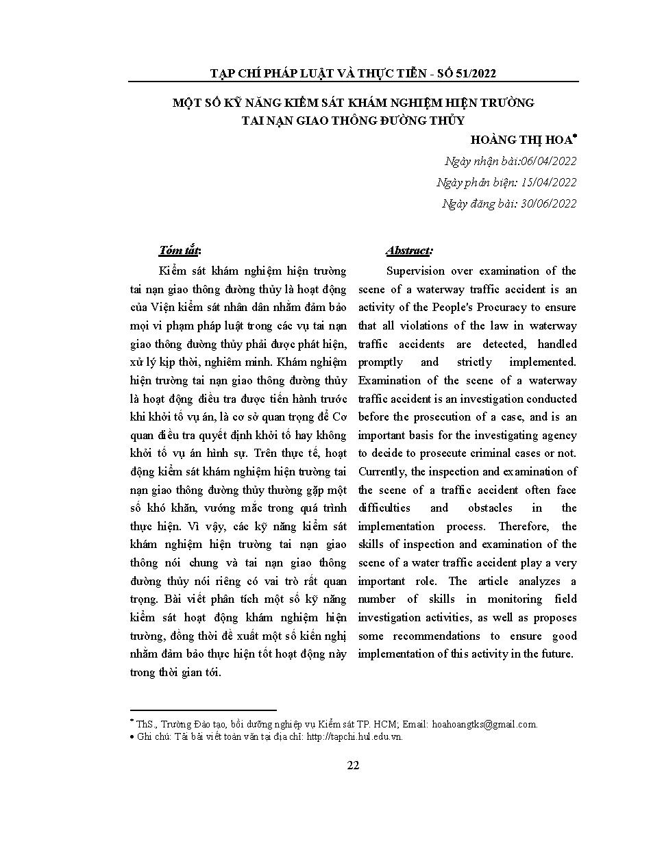 Một số kỹ năng kiểm sát khám nghiệm hiện trường tai nạn giao thông đường thủy = Some skills to inspect and examine the scene of a water traffic accident