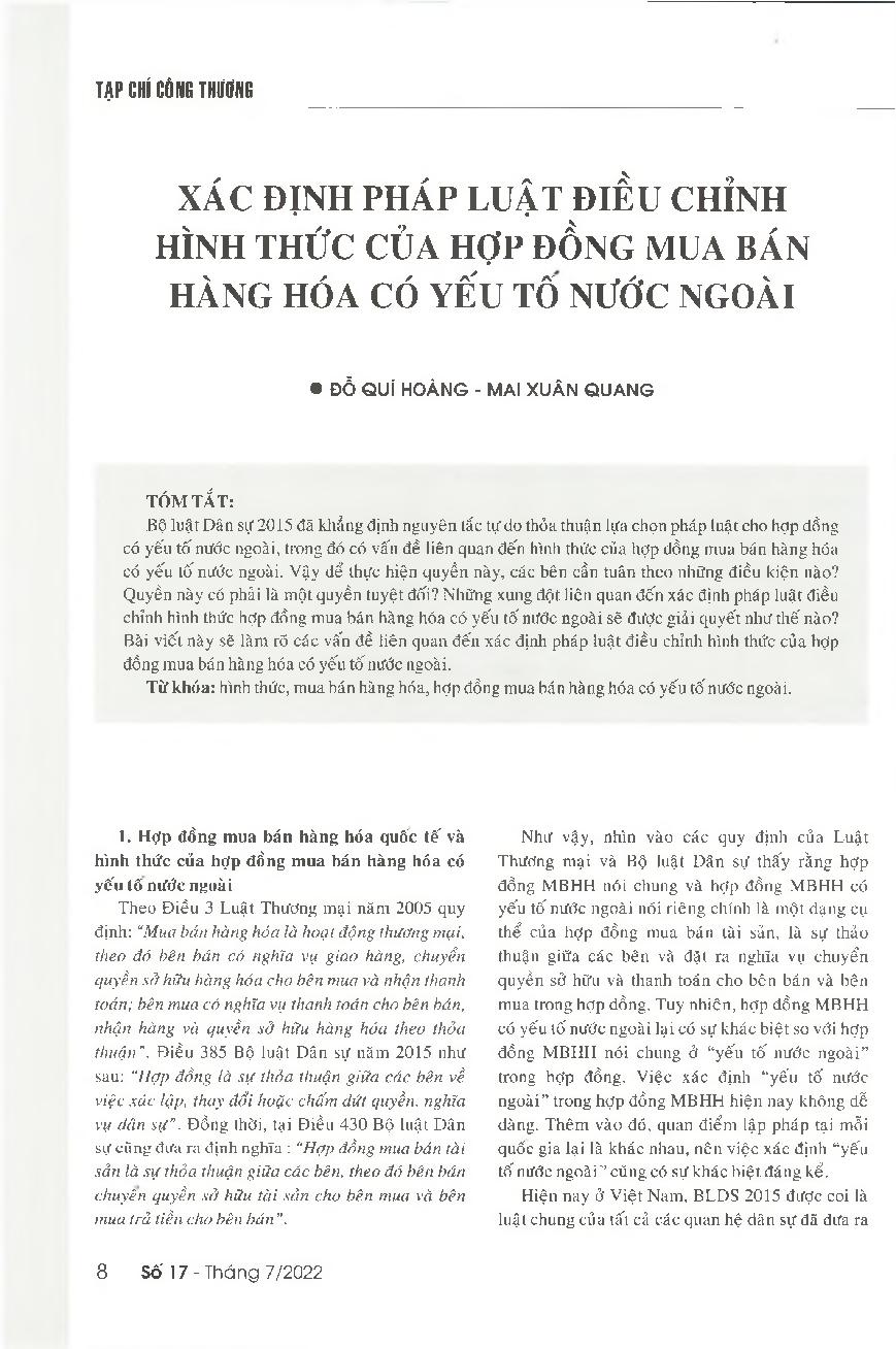 Xác định pháp luật điều chỉnh hình thức của hợp đồng mua bán hàng hóa có yếu tố nước ngoài = Determining regulations governing the form of sales contracts with foreign elements