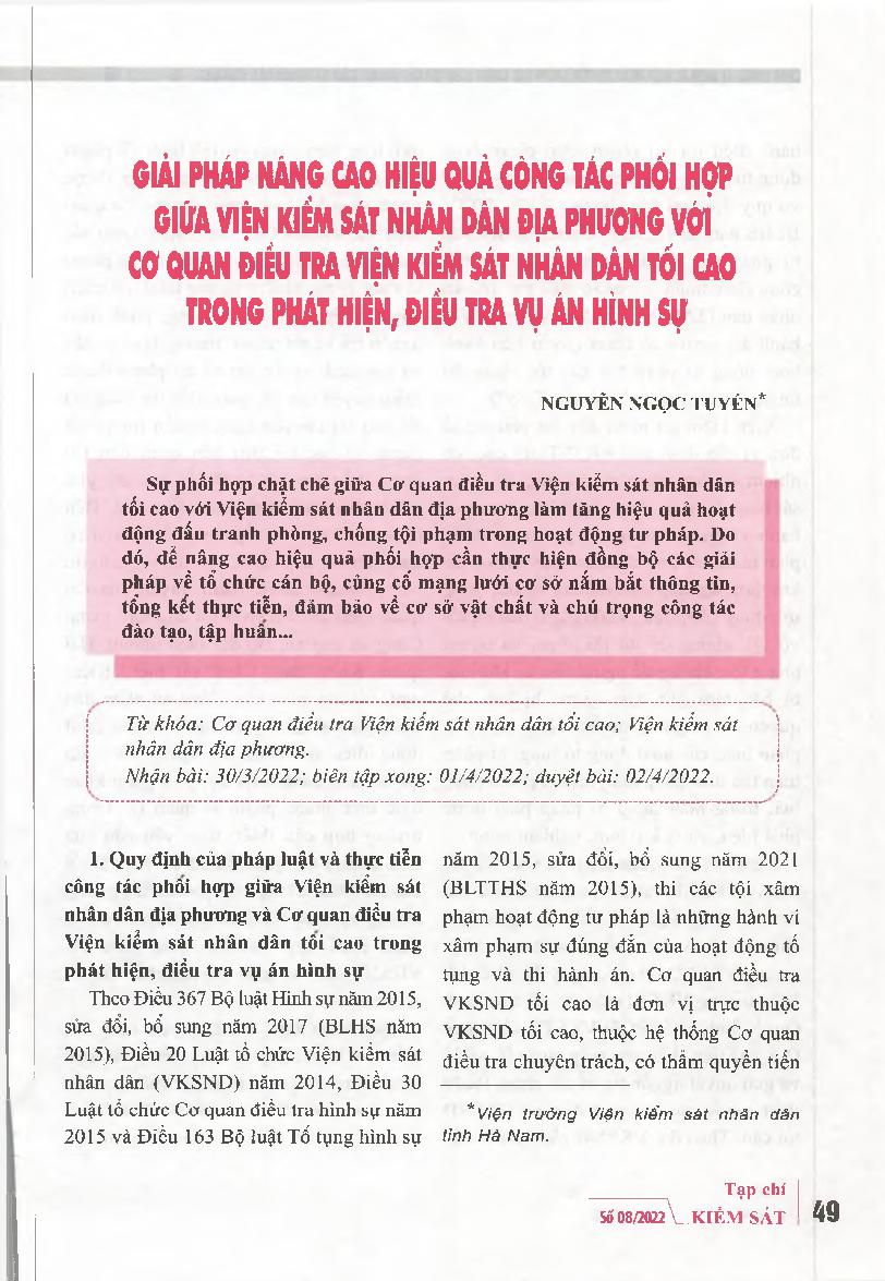 Giải pháp nâng cao hiệu quả công tác phối hợp giữa viện kiểm sát nhân dân địa phương với cơ quan điều tra viện kiểm sát nhân dân tối cao trong phát hiện, điều tra vụ án hình sự