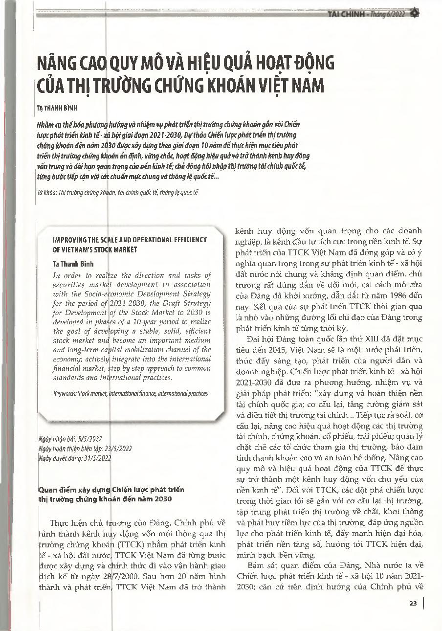 Nâng cao quy mô và hiệu quả hoạt động của thị trường chứng khoán Việt Nam = Improving the scale and operational efficiency of Vietnam&; 39;s stock market