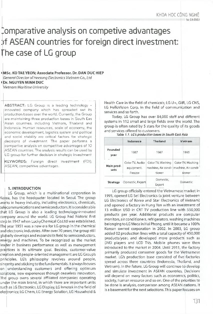 Phân tích so sánh lợi thế cạnh tranh của các nước ASEAN đối với đầu tư trực tiếp nước ngoài: Trường hợp của Tập đoàn LG = Comparative analysis on competive advantages of ASEAN countries for foreign direct investment: The case of LG group