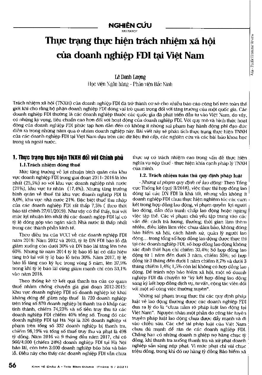 Thực trạng thực hiện trách nhiệm xã hội của doanh nghiệp FDI tại Việt Nam