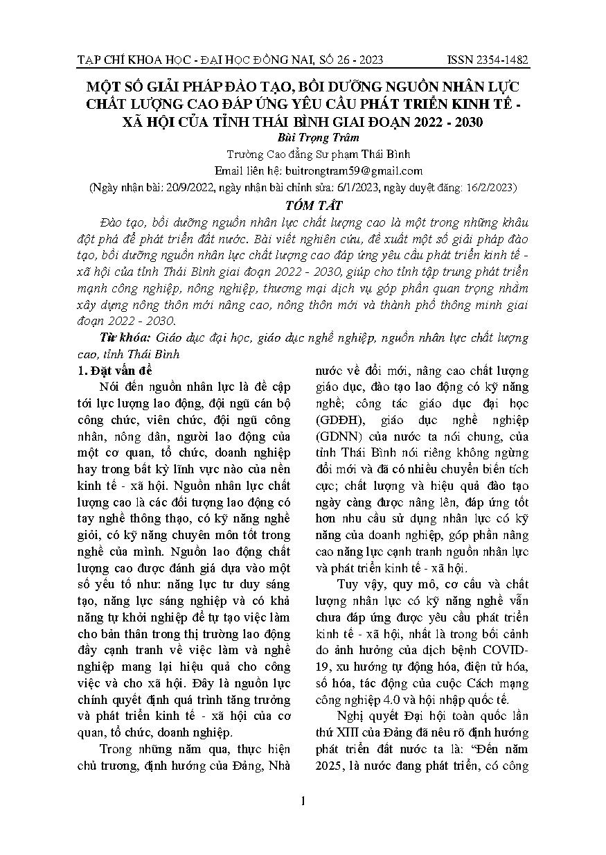 Một số giải pháp đào tạo, bồi dưỡng nguồn nhân lực chất lượng cao đáp ứng yêu cầu phát triển kinh tế - xã hội của tỉnh thái bình giai đoạn 2022 - 2030 = Some solutions for training and refresher courses of the high-quality human resources to meet the dema