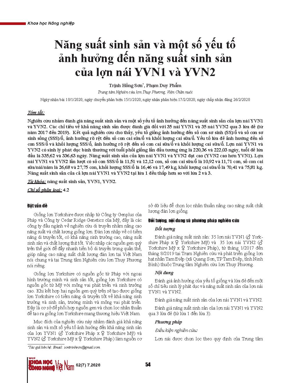 Năng suất sinh sản và một số yếu tố ảnh hưởng đến năng suất sinh sản của lợn nái YVN1 và YVN2 = Reproductive performance and factors affecting reproductive performance of YVN1 and YVN2 sows