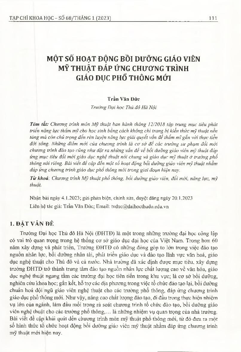 Một số hoạt động bồi dưỡng giáo viên mỹ thuật đáp ứng chương trình giáo dục phổ thông mới = Some activities for training art teachers meet new general education program