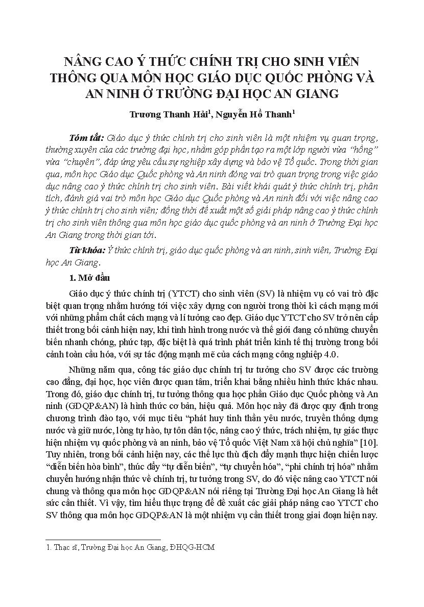Nâng cao ý thức chính trị cho sinh viên thông qua môn học giáo dục quốc phòng và an ninh ở Trường Đại học An Giang = Raising students' political awareness through course of national defense and security education at An Giang university