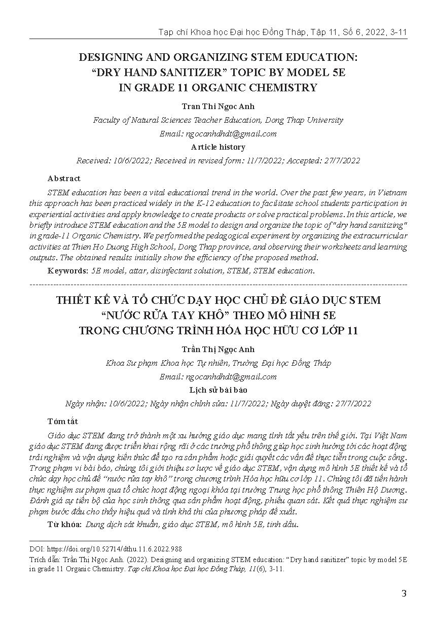 Thiết kế và tổ chức dạy học chủ đề giáo dục STEM “nước rửa tay khô” theo mô hình 5e trong chương trình Hóa học hữu cơ lớp 11 = Designing and organizing STEM education: “Dry hand sanitizer” topic by model 5E in grade 11 Organic Chemistry