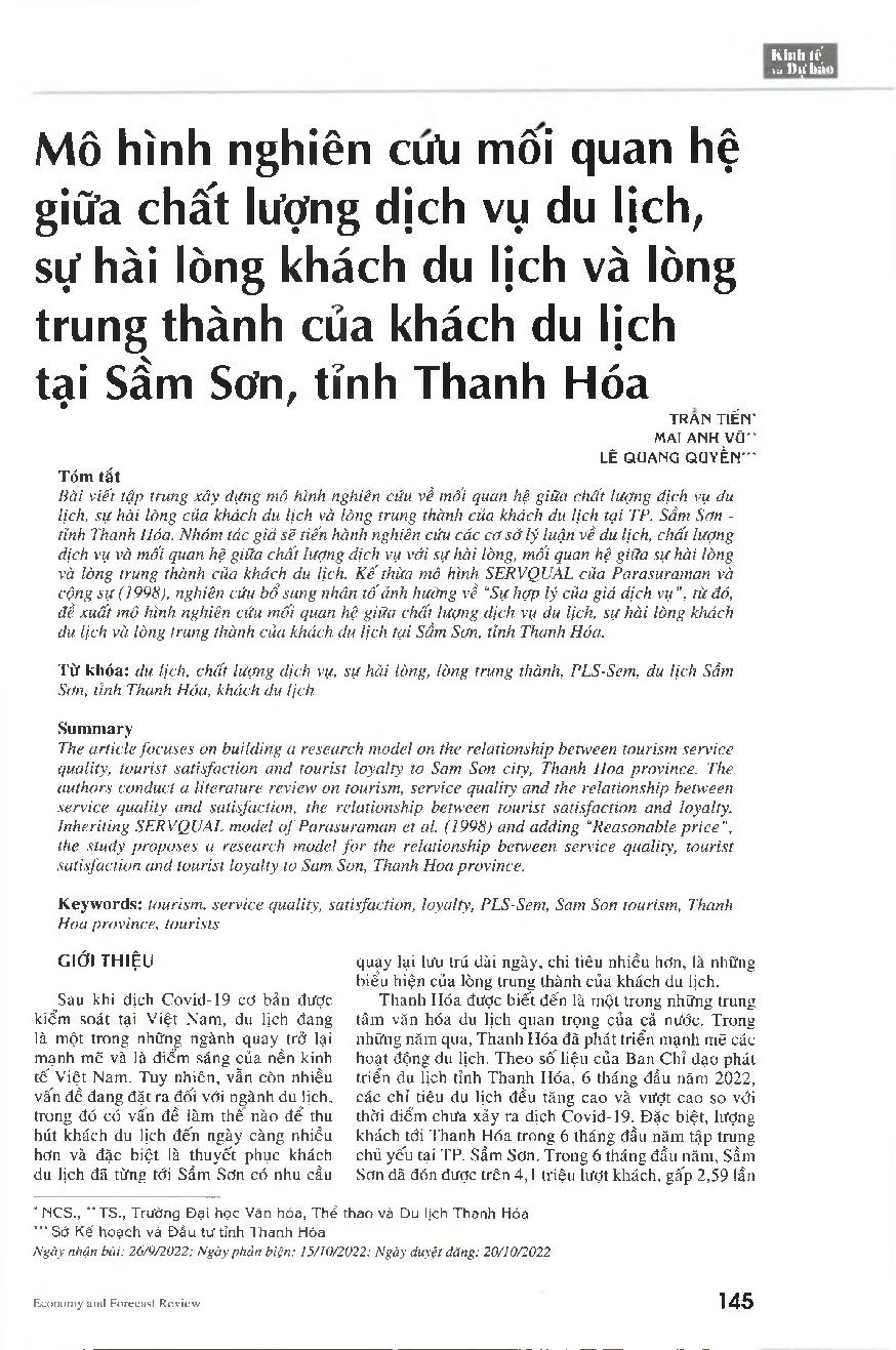 Mô hình nghiên cứu mối quan hệ giữa chất lượng dịch vụ du lịch, sự hài lòng khách du lịch và lòng trung thành của khách du lịch tại Sầm Sơn, tỉnh Thanh Hóa = A research model on the relationship between tourism service quality, tourist satisfaction and to
