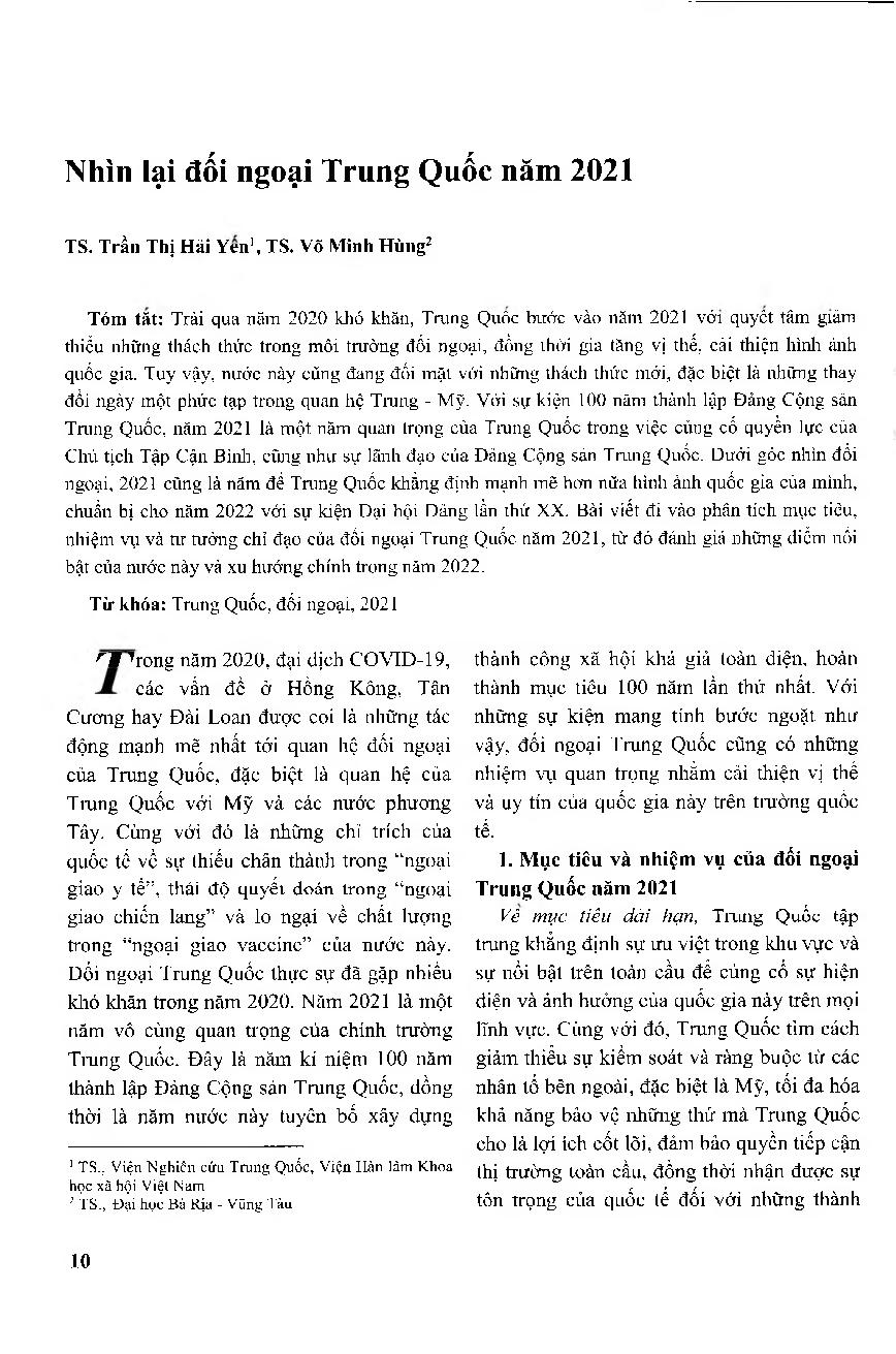 Nhìn lại đối ngoại Trung Quốc năm 2021 = A Look back at China&; 39;s Foreign Policy in 2021