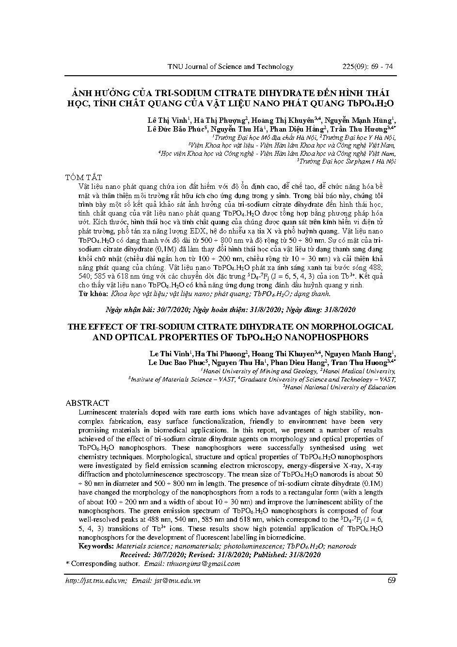 Ảnh hưởng của tri-sodium citrate dihydrate đến hình thái học, tính chất quang của vật liệu nano phát quang TbPO4.H2O = The effect of tri-sodium citrate dihydrate on morphological and optical properties of TbPO4.H2O nanophosphors