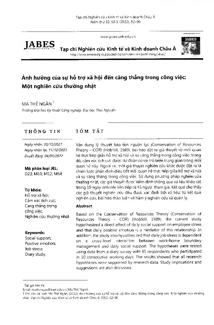 Ảnh hưởng của sự hỗ trợ xã hội đến căng thẳng trong công việc: Một nghiên cứu thường nhật = The Effect of Social Support on Work Stress: A Routine Study