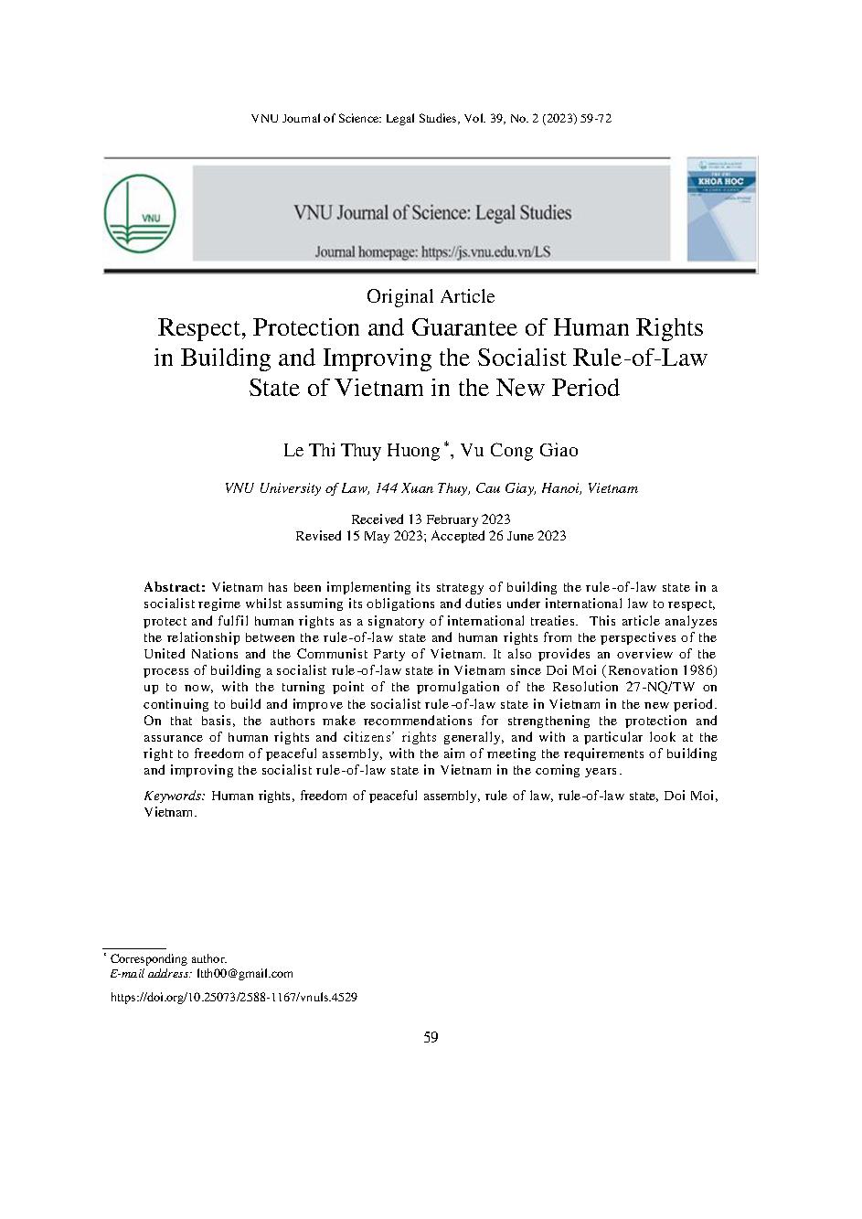 Tôn trọng, bảo vệ, bảo đảm quyền con người trong xây dựng, hoàn thiện Nhà nước pháp quyền xã hội chủ nghĩa Việt Nam trong giai đoạn mới = Respect, protection and guarantee of human rights in building and improving the socialist rule-of-law state of Vietna