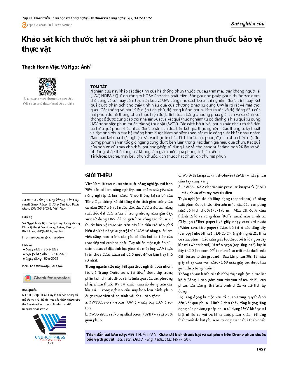 Khảo sát kích thước hạt và sải phun trên Drone phun thuốc bảo vệ thực vật = Investigating droplet size and spraying span of pesticide Drone