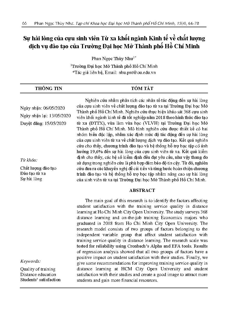 Sự hài lòng của cựu sinh viên Từ xa khối ngành Kinh tế về chất lượng dịch vụ đào tạo của Trường Đại học Mở Thành phố Hồ Chí Minh = The satisfaction of alumni from Distance in Economics sector about the quality of training service of Ho Chi Minh City Open University