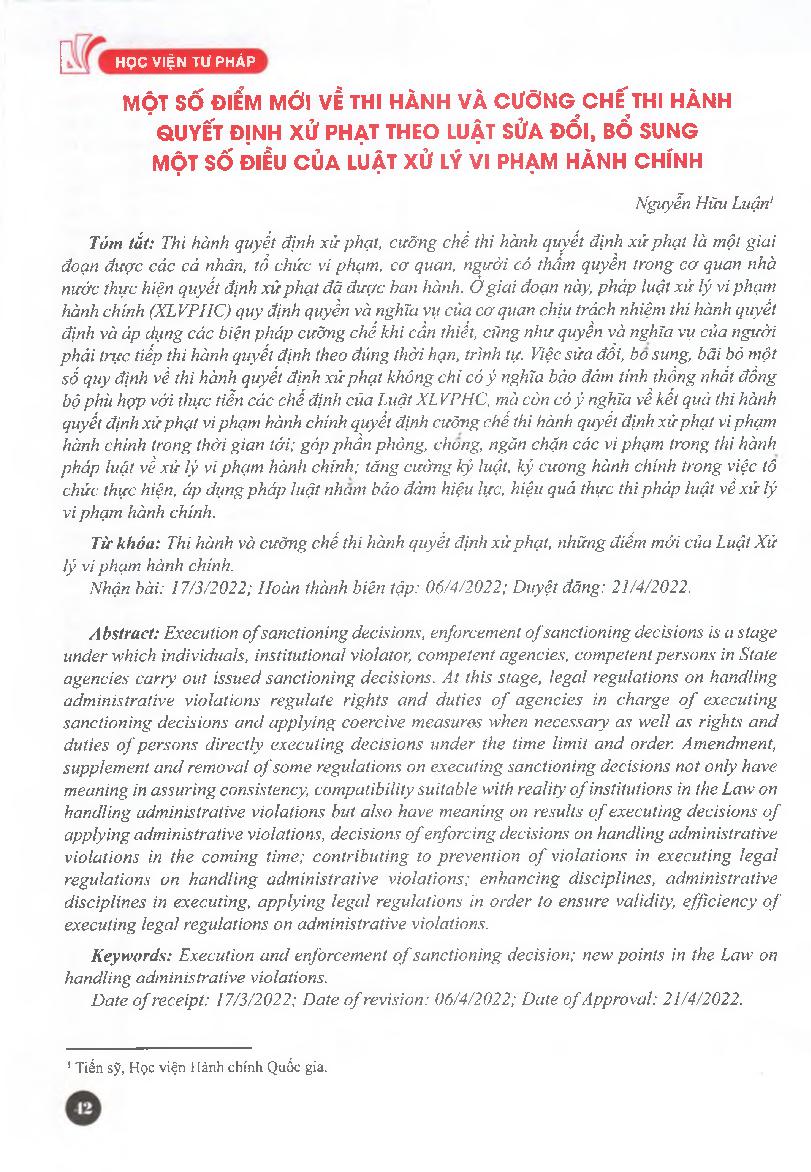 Một số điểm mới về thi hành và cưỡng chế thi hành quyết định xử phạt theo Luật sửa đổi, bổ sung một số điều của Luật Xử lý vi phạm hành chính = Some new points on execution and enforcement of sanctioning decision underthe Law on amending and supplementing
