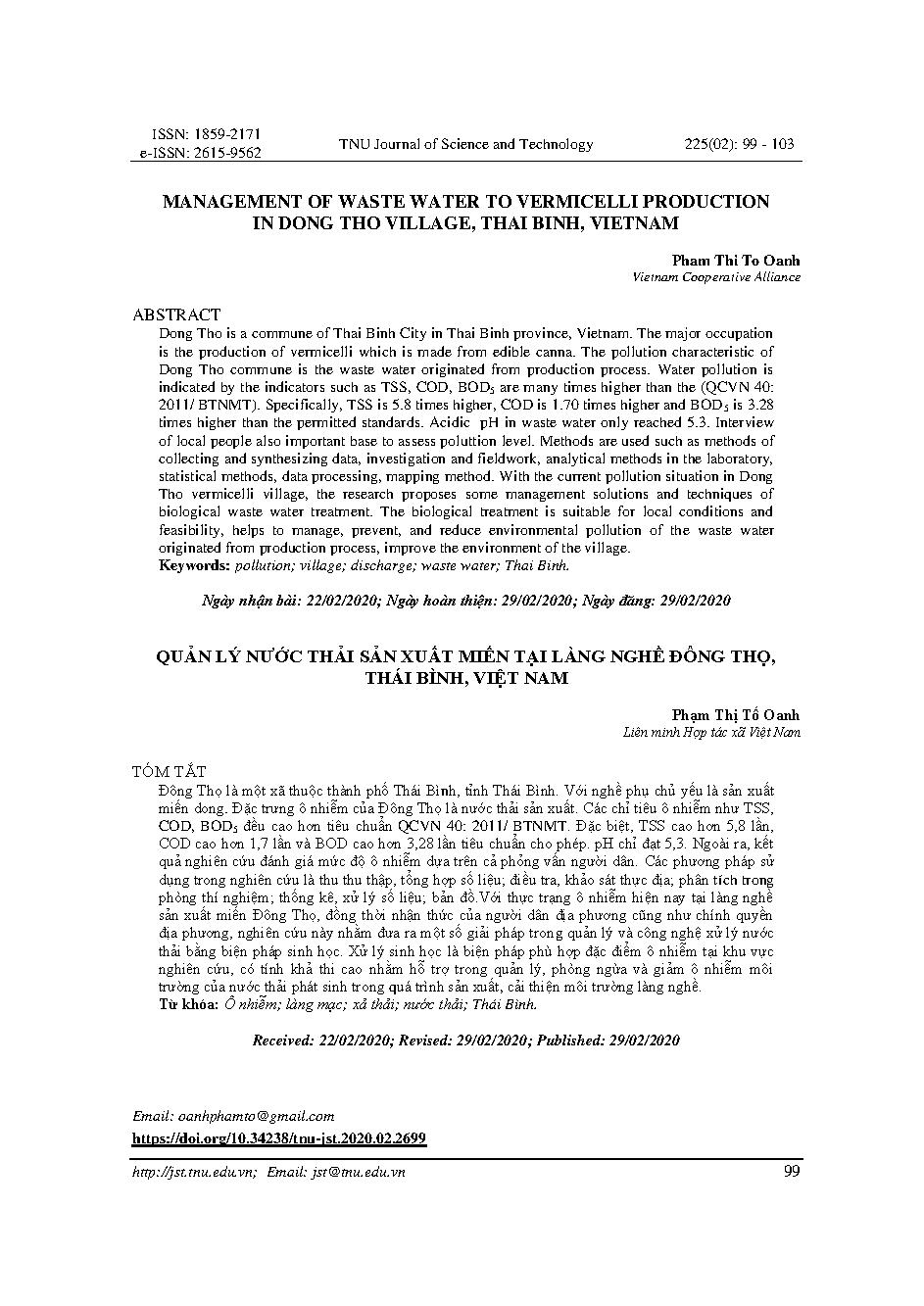Quản lý nước thải sản xuất miến tại làng nghề Đông Thọ, Thái Bình, Việt Nam = Management of waste water to vermicelli production in Dong Tho village, Thai Binh, Vietnam