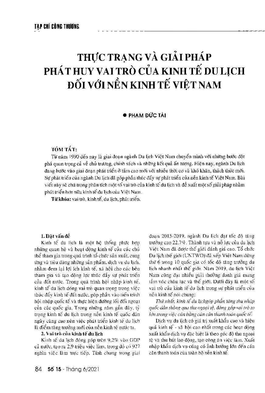 Thực trạng và giải pháp phát huy vai trò của kinh tế du lịch đối với nền kinh tế Việt Nam = Current situation and solutions to promote the economic role of tourism industry in Vietnam's economic development