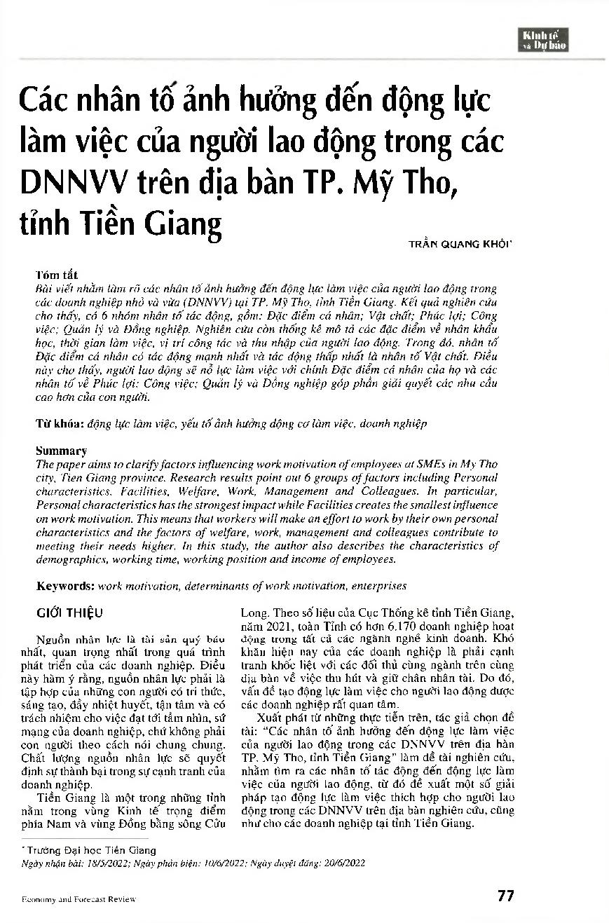 Các nhân tố ảnh hưởng đến động lực làm việc của người lao động trong các DNNVV trên địa bàn TP. Mỹ Tho, tỉnh Tiền Giang = Factors affecting the work motivation of employees at SMEs in My Tho city, Tien Giang province