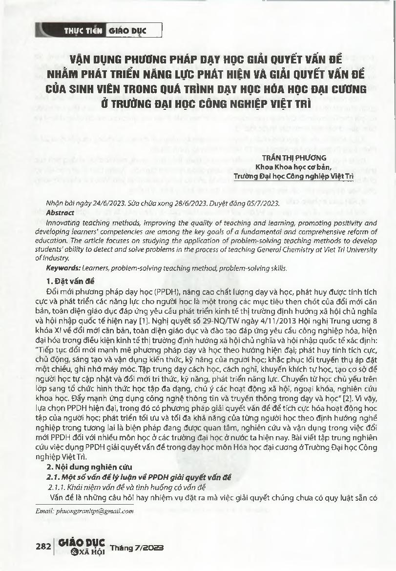 Vận dụng phương pháp dạy học giài quyết vấn đế nhằm phát triền năng lực phát hiện và giải quyết vấn đế cùa sinh viên trong quá trình dạy học Hóa học đại cương ở Trường Đại học Công nghiệp Việt Trì = Applying problem-solving teaching methods to develop stu