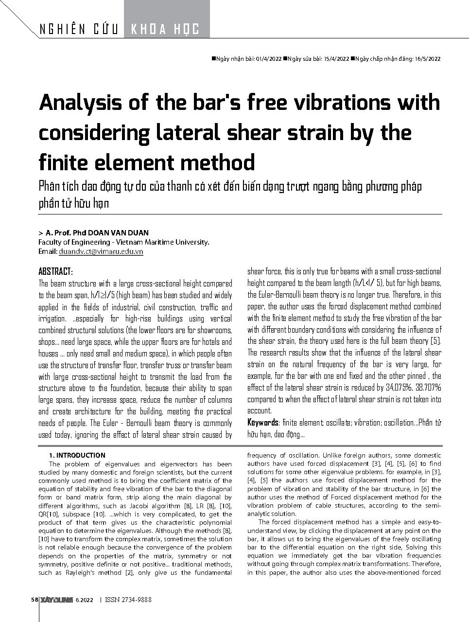 Phân tích dao động tự do của thanh có xét đến biến dạng trượt ngang bằng phương pháp phần tử hữu hạn = Analysis of the bar&; 39;s free vibrations with considering lateral shear strain by the finite element method